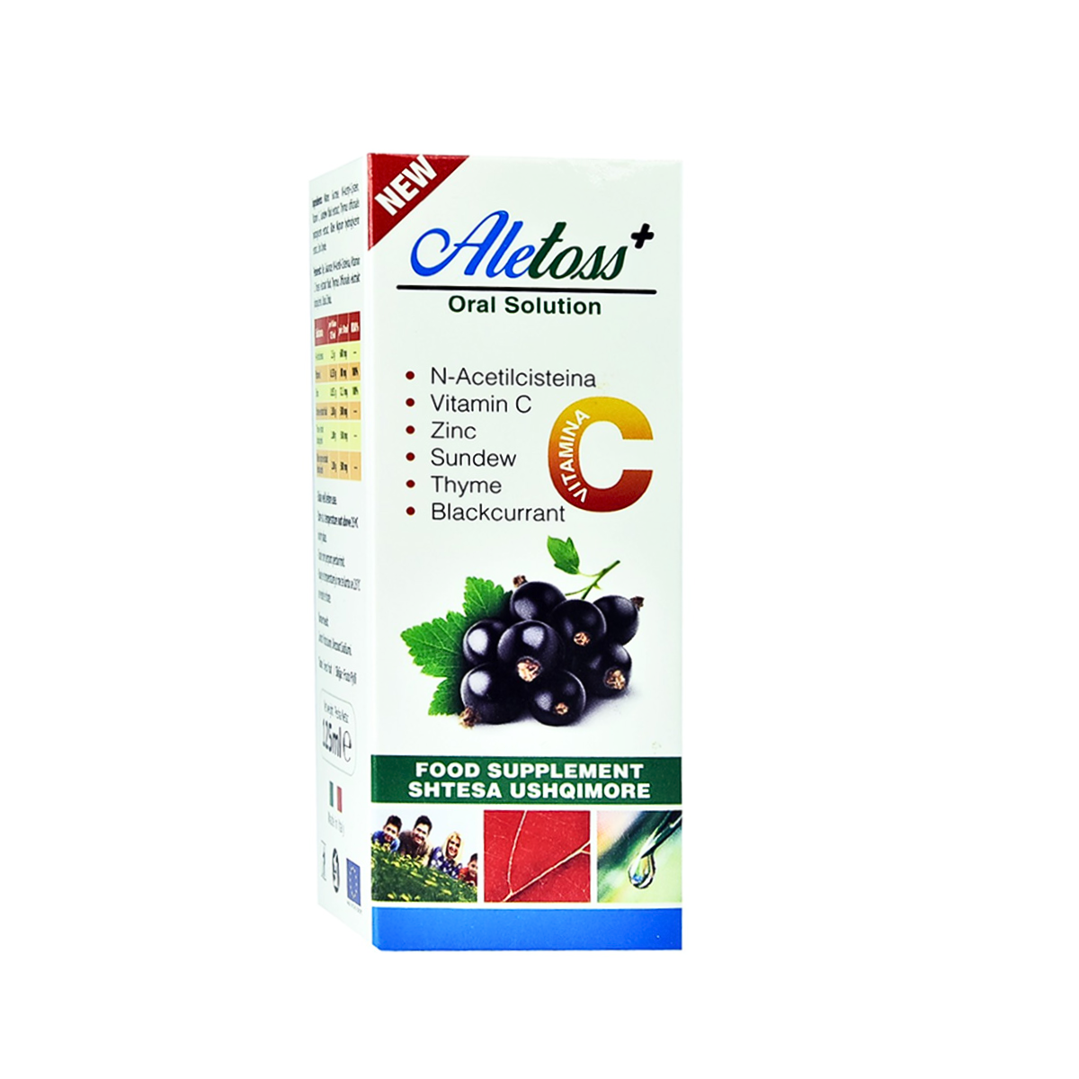Aletoss është një suplement ushqimor në një formë shurupi me shije frutash pylli që përmban N- Acetilcisteina, Vitaminë C, Zink, Drosera, Trumzë, Rrush të Zi. Shurupi promovon mirëqenien e rrugëve të frymëmarrjes, hollon sekrecionet bronkiale. Zinku dhe vitamina C kontribuojnë në funksionimin normal të sistemit imunitar. Ribes nigrum ( ribiza ) ka efekt antihistaminik.