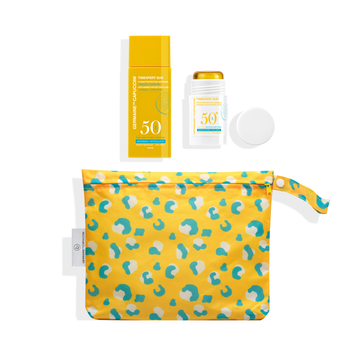 Seti ekskluziv nga Germaine de Capuccini vjen në një çantë moderne me stil animal print, që reflekton elegancë dhe trendet më të fundit të sezonit. Me dizajn veror në nuanca të ngrohta dhe motive të gjalla, kjo çantë është jo vetëm praktike dhe rezistente, por edhe një aksesor chic që të shoqëron në çdo udhëtim apo ditë plazhi. Brenda saj gjenden dy produkte esenciale për mbrojtjen dhe kujdesin e avancuar të lëkurës: Fluid SPF50 për lëkurë normale-mix, që mbron nga plakja, njollat dhe ndotja duke rigjallëruar lëkurën, si dhe Stick mbrojtës SPF50, ideal për zonat delikate dhe perfekt për aplikim të shpejtë në çdo moment, edhe mbi make-up. Një kombinim perfekt i stilit dhe performancës për një lëkurë të mbrojtur dhe rrezatuese çdo ditë.