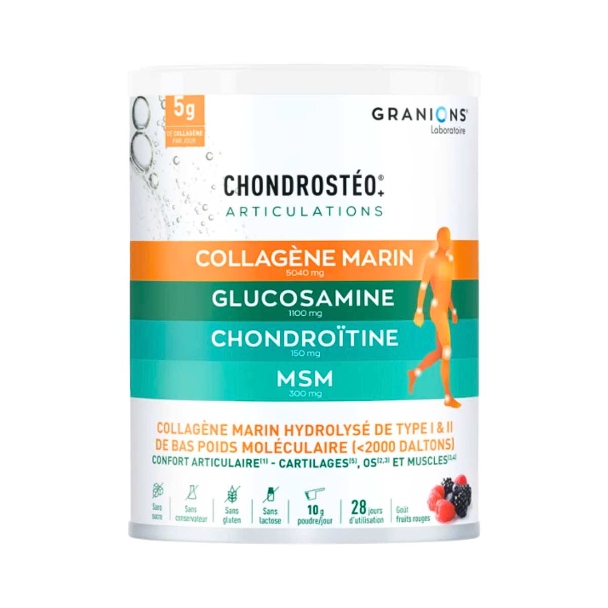 Suplementi ushqimor Granions Chondrostéo Collagen Marin pluhur 280 g është një formulë e krijuar posaçërisht për të promovuar shëndetin dhe mirëqenien e nyjeve. Ky produkt është një aleat i mirë për personat që duan të ruajnë lëvizshmërinë dhe fleksibilitetin e nyjeve, pasi kombinon kolagjenin detar me lëndë ushqyese të tjera thelbësore për efekt maksimal.