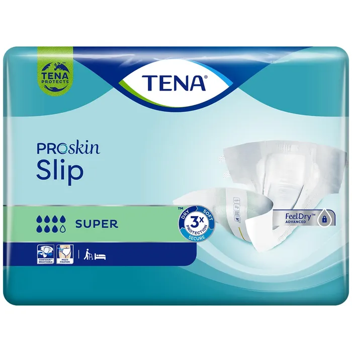 Mbrojtje për rrjedhje të rënda urinare. TENA Slip është një pelenë me fletë mbajtëse për të siguruar mbrojtje nga rrjedhjet, rehati dhe një përshtatje të lartë. TENA Slip është bërë nga pëlhurë e butë, jo e endur që ngjitet në konturet e trupit dhe ofron mbrojtje të shkëlqyer nga rrjedhjet. Është e përshtatshme për njerëzit me lëvizshmëri të kufizuar ose kur ndërrohen në shtrat. Falë teknologjisë FeelDry Advanced™, produkti thith shpejt lëngjet, duke e mbajtur lagështinë larg lëkurës për të ruajtur një ndjesi të thatësisë afatgjatë, ndërsa veshja e jashtme me teknologjinë Confioair™ është e frymëmarrshme për të lejuar lëkurën të marrë frymë. Këto përfitime kombinohen për të ruajtur shëndetin e lëkurës. Dizajni i produktit me fletë mbajtëse të gjera lejon ndryshime të shpejta pavarësisht nëse përdoruesi është në këmbë apo shtrirë. TENA Slip mund të ripozicionohet lehtësisht për të arritur një përshtatje të lartë dhe për të ofruar mbrojtje të shkëlqyer nga rrjedhjet.