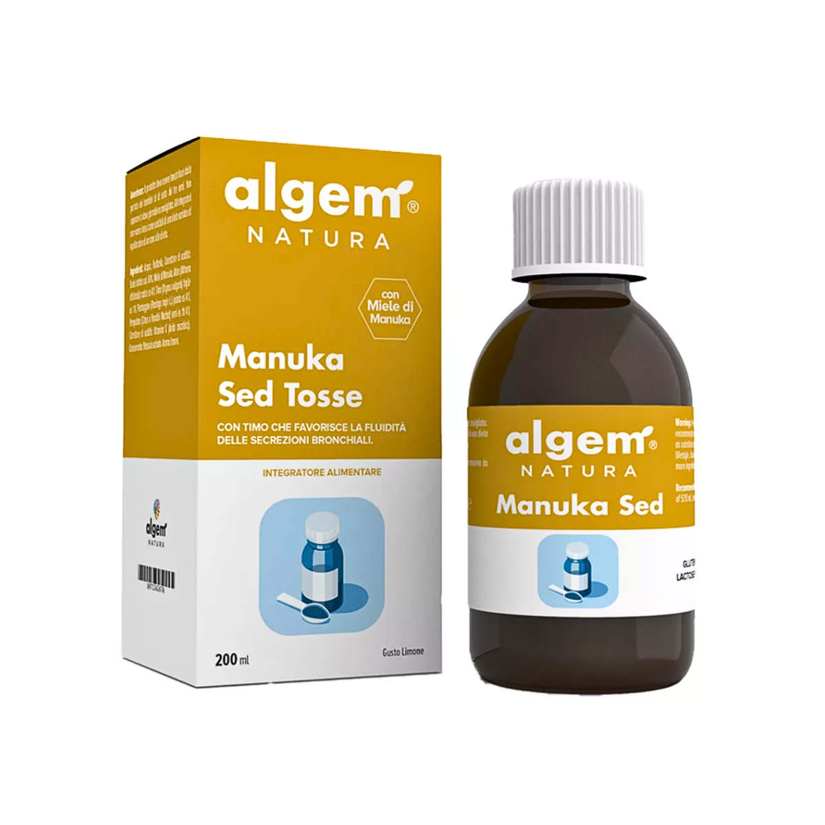 Algem Natura Manuka Sed Tosse Adult është një suplement ushqimor në formë të lëngshme, me shije limoni, i formuluar me mjaltë Manuka dhe ekstrakte bimore, i cili ndihmon në funksionimin normal të sistemit të frymëmarrjes. Rekomandohet në rastet e kollës së thatë dhe kollës me sekrecione, duke qetësuar fytin dhe lehtësuar frymëmarrjen.