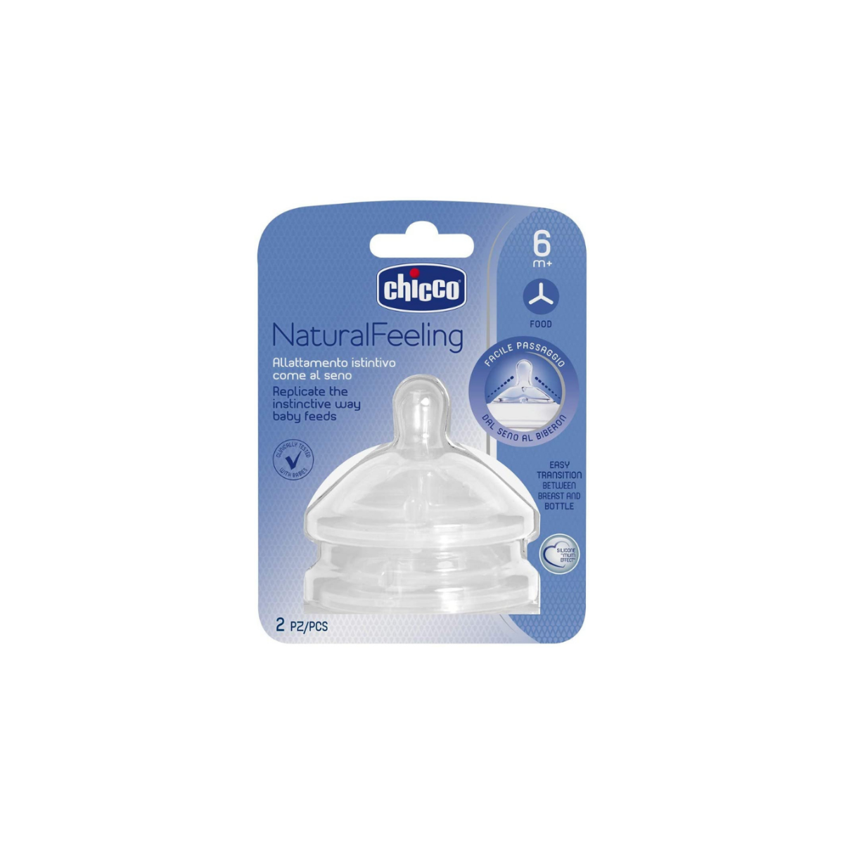 Chicco NaturalFeeling është një kokë biberoni e dizajnuar për foshnja mbi 6 muaj, e përshtatshme për ushqime më të dendura (Food) dhe për fazën e avancuar të ushqyerjes.