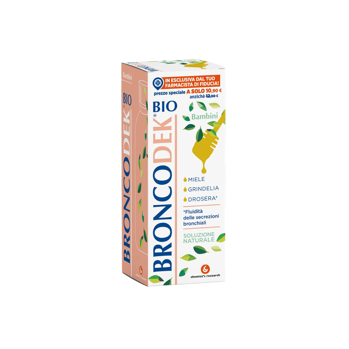 Broncodek Bio Bambini indikohet në rastet e kollës së thatë dhe me sekrecione, kur është e nevojshme të nxitet fluidifikimi i sekrecioneve bronkiale dhe të qetësohen irritimet e rrugëve të frymëmarrjes.