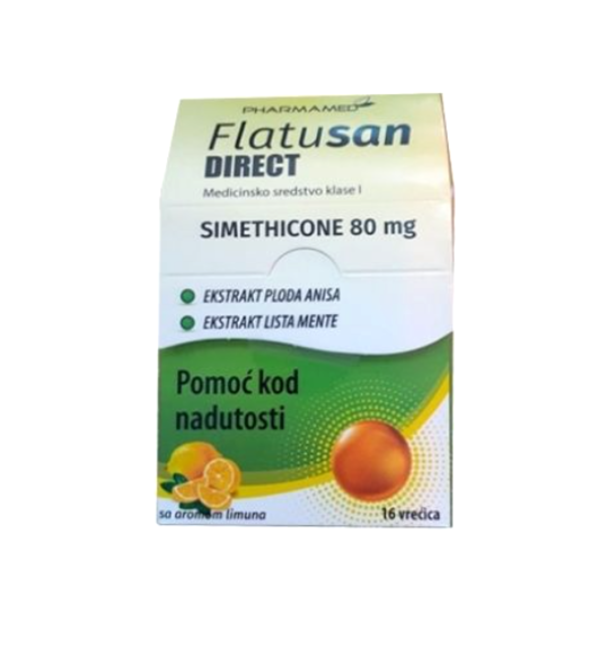 Flatusan Direct përmban 80 mg simetikon, ekstrakt të frutit të anisës dhe ekstrakt të gjetheve të mentes. Simetikoni ndihmon në largimin e gazrave intestinalë.