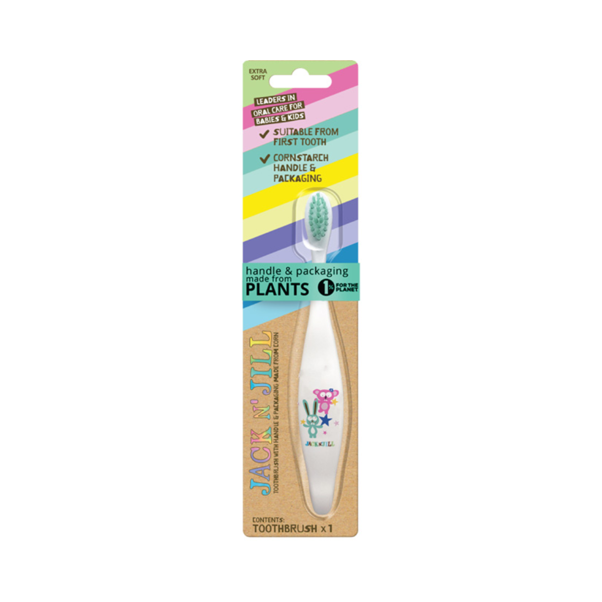 Furçat e dhëmbëve Jack N’ Jill janë biodegradueshme dhe kompostueshme, me doreza të bëra nga amidoni i misrit dhe fije najloni që mund të riciklohen. Dorezat janë të lëmuara dhe ergonomike, ideale për duar të vogla dhe të buta për mishrat, duke i bërë të përshtatshme që nga dhëmbi i parë.