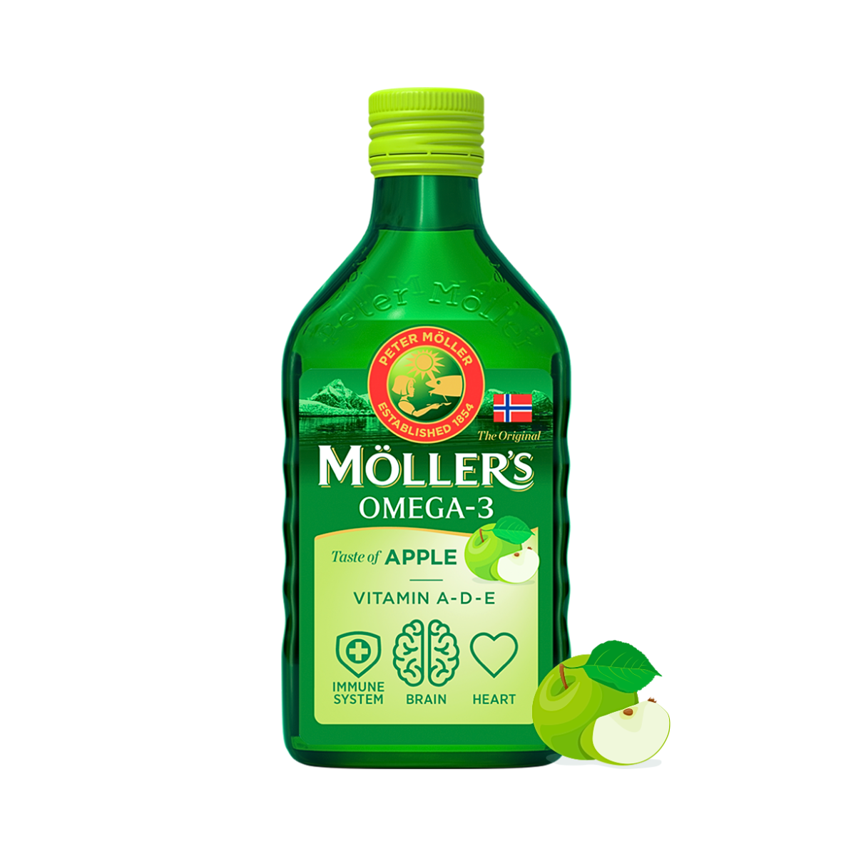Omega-3 e Möller’s me shije molle është vaj peshku i pastër norvegjez me shije natyrale molle. Një kombinim unik i omega-3 natyrale (1.000 mg DHA dhe EPA për lugë ëmbëlsire) dhe vitaminave A, D dhe E.