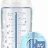 Biberoni me kontroll temperature NUK: ky tregues jep sigurinë se përmbajtja e shishes që ushqehet nuk është shumë e nxehtë. Nëse ushqimi është shumë i nxehtë, treguesi normalisht blu do të bëhet i bardhë. E përshtatshme për nofullën, silikon i butë, pa BPA. Testuar klinikisht*: për një kombinim optimal të ushqyerjes me gji dhe me shishe. Kombinime të pakufizuara – me të gjitha produktet NUK First Choice.