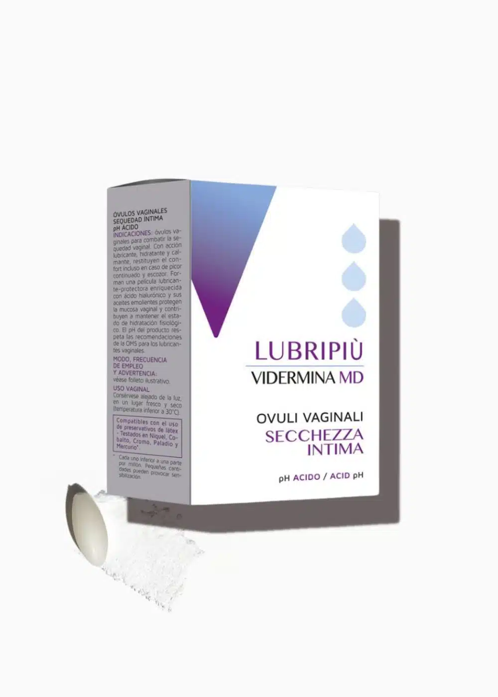 Globulat vaginale Vidermin MD Lubripiu janë të dobishme për lehtësimin e thatësisë vaginale. Me një veprim hidratues dhe qetësues, ato rikthejnë rehatinë edhe në rast të kruajtjes dhe djegies shoqëruese. Për shkak të formimit të një filmi mbrojtës-lubrifikues të pasuruar me acid hialuronik, dhe për shkak të pranisë së vajrave zbutës, ato mbrojnë mukozën vaginale dhe kontribuojnë në ruajtjen e gjendjes fiziologjike të hidratimit. Me pH të rekomanduar nga OBSH (Organizata Ndërkombëtare e Shëndetësisë) për lubrifikantët intimë.